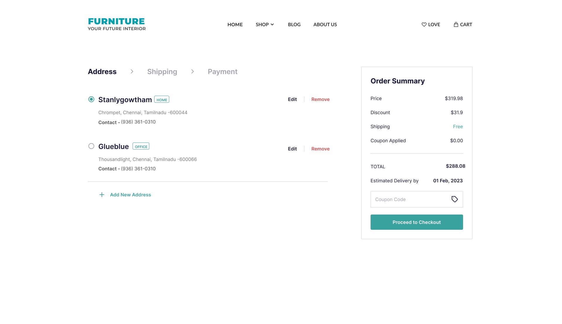 A simple and structured address form that lets users add, edit, and manage delivery details with ease and accuracy.`
